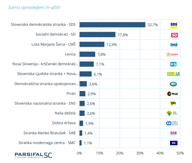 Äe bi bile volitve v DrÅūavni zbor RS prejÅĄnjo nedeljo bi slavila SDS, in sicer bi med opredeljenimi dobila 32,7 odstotka glasov. Na drugem mestu bi se znaÅĄli Socialni demokrati, ki bi jih volilo 17,8 odstotka volivcev, sledili bi Lista Marjana Å arca z 12,4 odstotki glasov in Levica z 7,8 odstotka glasov. Nova Slovenija se je znaÅĄla na petem mestu, volilo bi jo namreÄ 7,1 odstotka glasov, parlamentarni prag bi prestopila samo ÅĄe Slovenska ljudska stranka in Nova ljudska stranka Slovenije s 6,1 odstotka glasov. Stranke NaÅĄa DeÅūela, SAB, SNS, DeSUS, Pirati, SMC in Dobra drÅūava ne bi dobile poslanskih sedeÅūev.